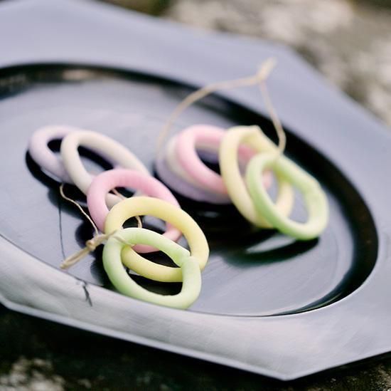 彩り豊かな五色の環を麻ひもで結わえ、藤の花房に見立てて。